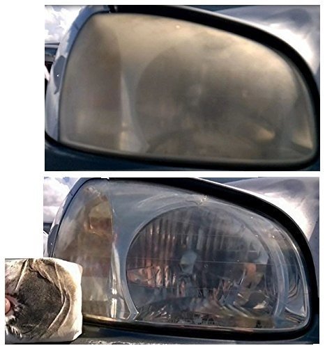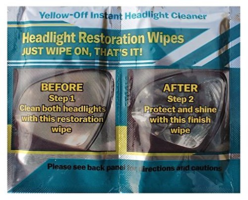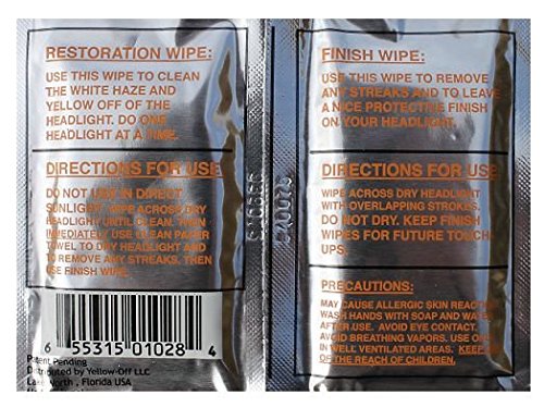 Yellow-Off Headlight Cleaner Instant Handy Wipe Set. Two years in production. This soon to be patented product has been tested and refined until perfection was achieved. This wipe on formula is amazing. No scrubbing, no rubbing, no damaging your headlights with sandpaper and rubbing compound. If you use sandpaper, rubbing compound, toothpaste or any other abrasives on your headlight you will permanently damage the protective UV coating on your lens. Two sets of our Instant Handy Wipe Sets that will complete 2 cars. Two Large Handy Cleaning Restoration Wipes Loaded With Enough Headlight Cleaner to do Four headlights. Two Large finishing wipes that will take care of any streaks and add a nice protective shiny layer to your headlights. Just wipe on Thats it !! We also have for sale our single wipe sets here on Amazon.