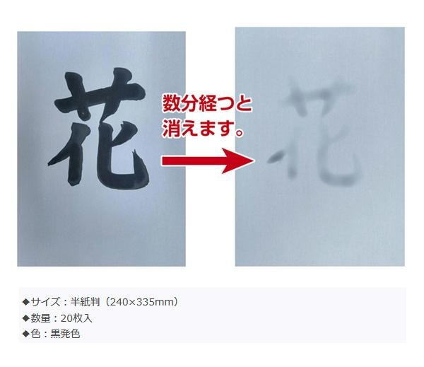 | 書いてからしばらく経つと乾いて、書いた箇所が消えます。墨やインクを使わないので、周りを汚したりする心配がなく、手軽に書道練習ができます。使用状況により500回程度使用可能です。 |