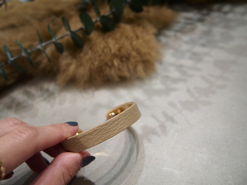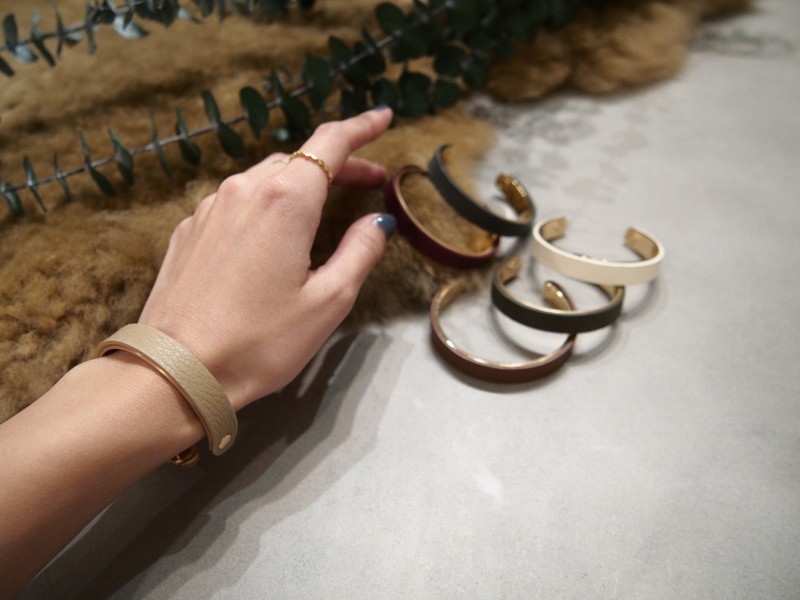 ゴールドのプレートに上質なレザー合わせたトレンドのレザーバングル。おしゃれな手元を演出してくれます。使いやすいカラーなので、デイリーな普段のコーディネートにさりげなく馴染むオススメのアイテムです。