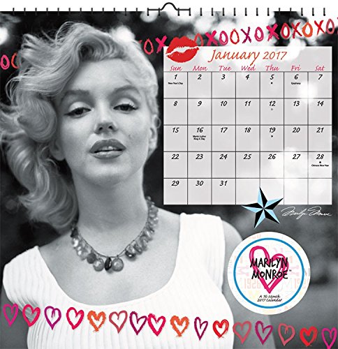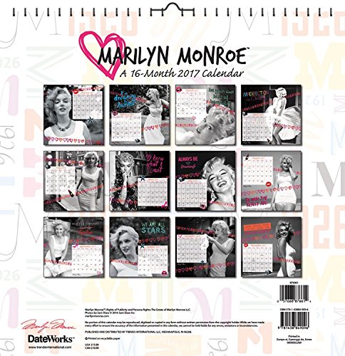 16-month Marilyn Monroe calendar 2017 includes 13 stunning images with large grids. This 12" x 12" calendar features an opening spread with a beautiful four-month (September-December 2016) calendar to plan the last months of the year and prepare for 2017.