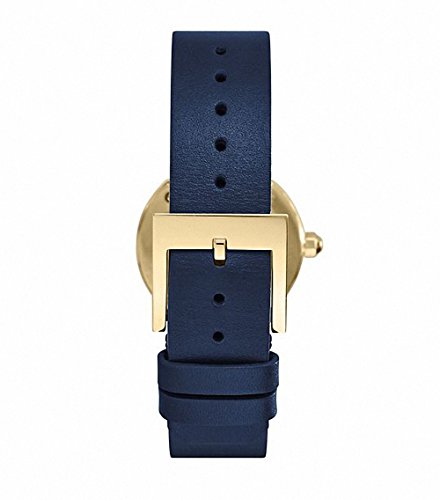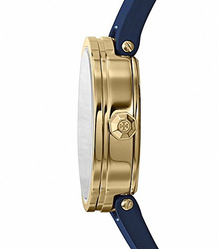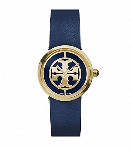 Reva Watch, Navy Leather/Gold-Tone, 28 mm SWISS MADE Scratch-resistant sapphire crystal with anti-reflective coating. Case size: 28 mm Case thickness: 7.5 mm Case lug width: 16 mm Navy dial with smooth enamel finish and gold-plated stainless-steel logo. Three hands. Swiss quartz movement. Octagon-shaped crown. Buckle closure. Water resistance: 3 ATM Gold-plated stainless-steel case. Italian leather strap with 'T' pattern on underside.