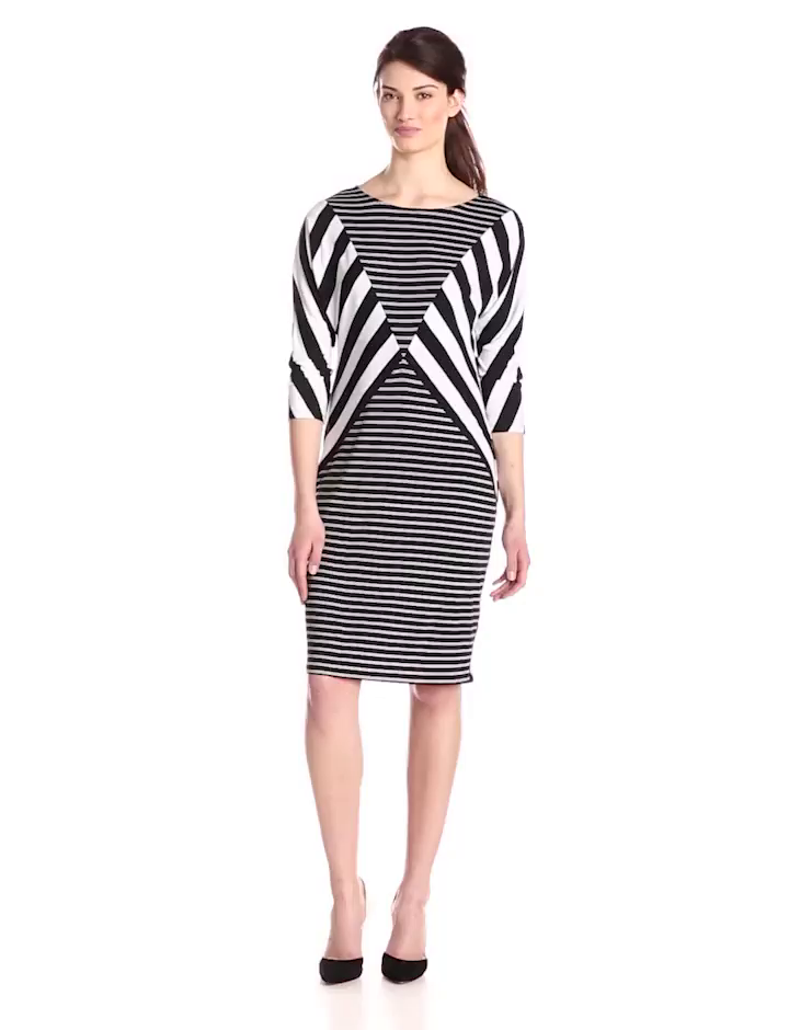 Sheath dress with crew neckline printed with mixed wide and slender stripes