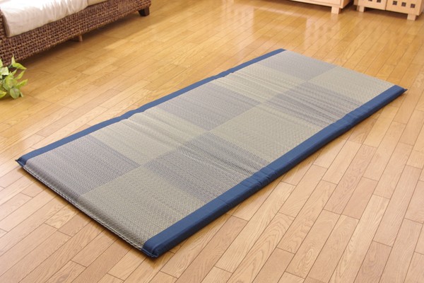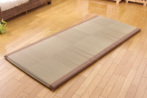 国産(九州産)のい草を使用したごろ寝マットです。い草には1.綿の約3倍の吸湿性があり汗のじめじめを軽減します。2.湿度の調整作用があり、蒸れにくく快適な就寝を促します。3.汗のにおいの元となる化学物質を90%以上抑え、においを軽減します。などの効果があります。中材にはクッション性にこだわり固わた40mmを使用していますので程良い弾力性があり、フローリングでも快適にご使用頂けます。青森ヒバ加工を施しています。(抗菌・防臭効果)