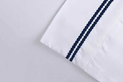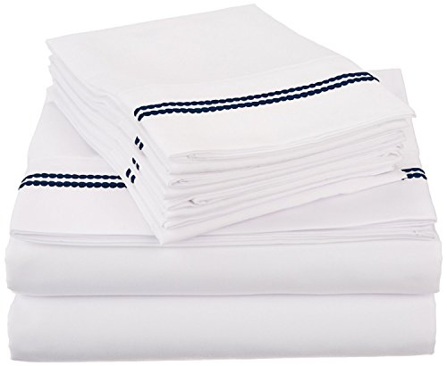 Super Soft, Light Weight, 100% Brushed Microfiber, Twin XL, Wrinkle Resistant, 4 Piece Sheet Set, White with Navy Blue 2-Line Embroidery in Gift Box
