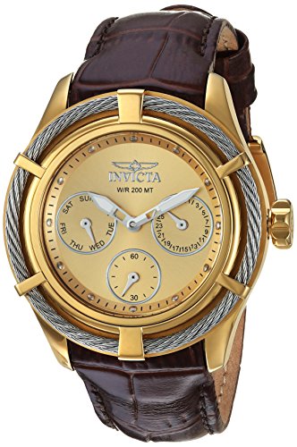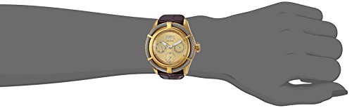 Gold metal sunray dial with steel luminous hands and steel hour markers, chronograph with day, date and 60 m sub dials, brown leather band and push crown