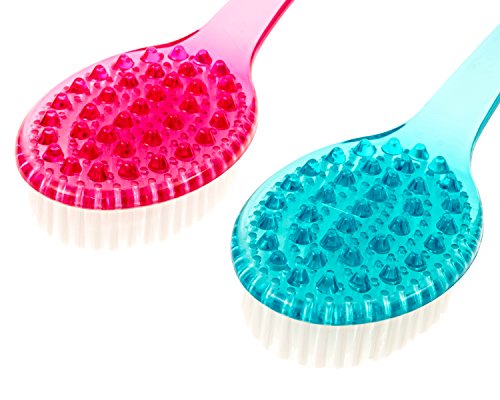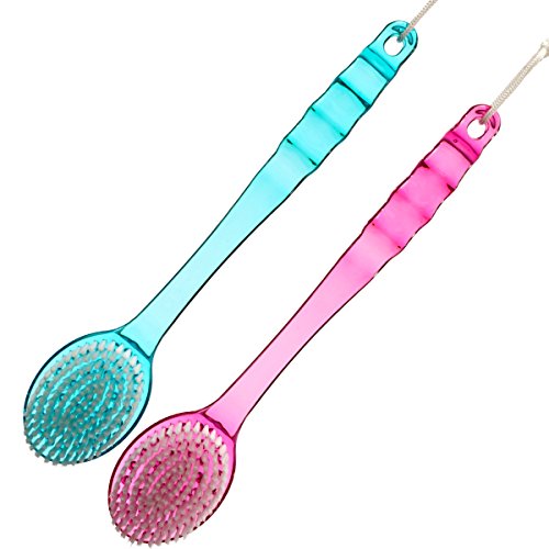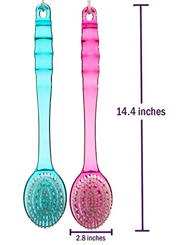 -. Feature : SIMPLIFY SHOWERING WITH OUR UNIQUE DESIGN 14-inch long handle allows you to reach every part of your body, and the handle is gently arched to help the brush conform to your body contours.Perfect Mother's Day Gift! / CLEANSE & EXFOLIATE IN A SINGLE STEP Specially designed bristles lather up shower gel or body wash to purify your skin while removing dead tissue to promote silkier, softer skin. / MASSAGE & STIMULATE When used dry, the massage nubs on the brush promote circulation to the skin to support collagen production and cellular repair. Used wet or dry, the brush treats you to a luxurious massage. / NO-SLIP GRIP - MOLD/MILDEW RESISTANT, Unique textured handle stays firmly in your grasp; Rope loop at the end lets you hang the brush up for easy drying. / GET MORE FOR YOUR MONEY - This set includes a pair of our bath brushes (pink and blue)! You can use one dry and one for showering, keep one in your travel bag and one in the bathroom or have a spare at the ready!