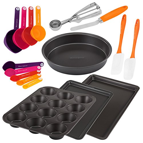 - 4-pc. Measuring cup, 5-pc. Measuring spoon, cookie scoop, icing spreader, spatula, spoontula, two cookie sheets, 9" round cake & 12-cup muffin pan