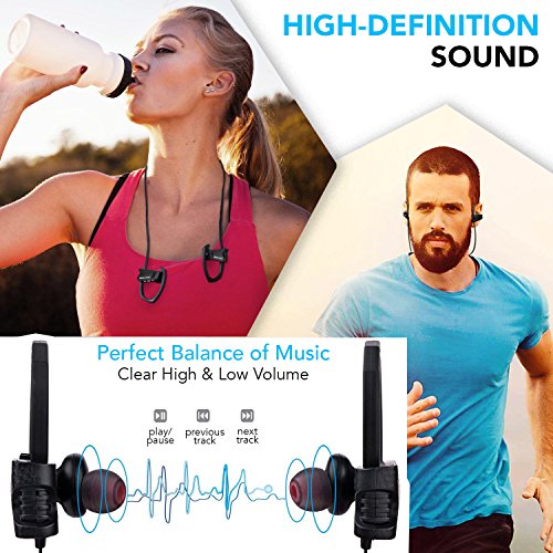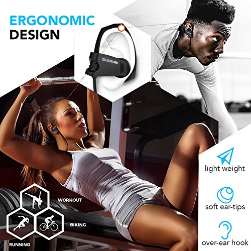 -. Feature : WHAT IS IMPROVED IN BLUETOOTH HEADPHONES ZEUS STORM? Using new high quality headphones speakers, we achieved a better balance between deep bass, soaring highs and clear midrange. Applied new innovations of water resistant Nano technologies for sport headphones we achieved IPx7 waterproof rating. / WORKOUT SPORTS HEADPHONES: Bluetooth earbuds the best for running headphones. Fits for yoga, exercises, hiking, gym, fitness, travelling. Wireless headphones in ear Zeus Storm great for indoor and outdoor activities and comfortable for everyday use. / WIRELESS EARBUDS WITH MIC: Noise cancelling microphone with CVC 6.0 technology built-in bluetooth headphones reduces outside noise and offers strong signal up to 33 feet. Bluetooth earbuds with mic and volume control allow make/end calls with your hands free! / UP TO 8 HOURS OF MUSIC: Zeus Storm sport headphones in ear provide up to 8 hours of play time on a full charge at average volume and 200 hours at stand-by mode. Powerful polymer battery (100AH) takes just up to 2 hours to charge your wireless headphones fully. / BLUETOOTH HEADPHONES AND UNIVERSAL CONNECTIVITY: Bluetooth V4.1 technology allows easily to pair your sport earbuds to iPhone, and Android phones. Multi-points connection: the wireless earbuds can pair two Bluetooth devices at the same time. GET 100% SATISFACTION or get a refund/replace! 30 days no questions asked return policy and a TWO-YEAR WARRANTY - your purchase is totally RISK-FREE!