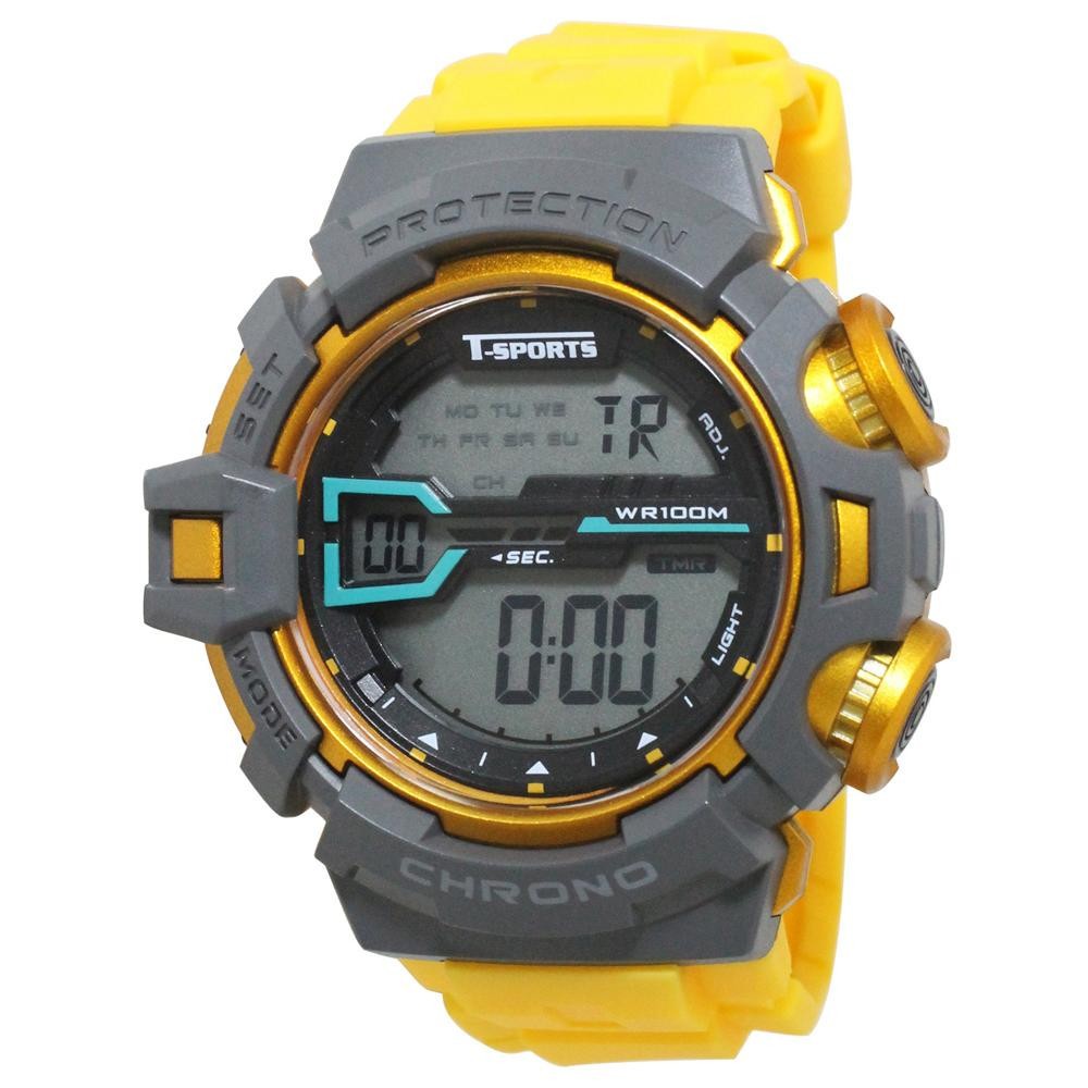 アラームやカウントダウンなどの機能が付いたデジタル表示の腕時計。