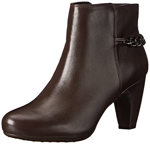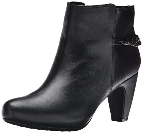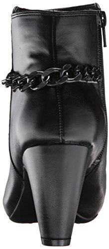 Ankle boot featuring almond toe, molded heel, and curb chain draped from back