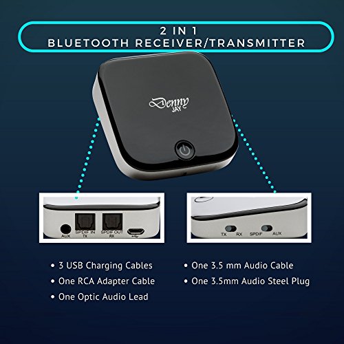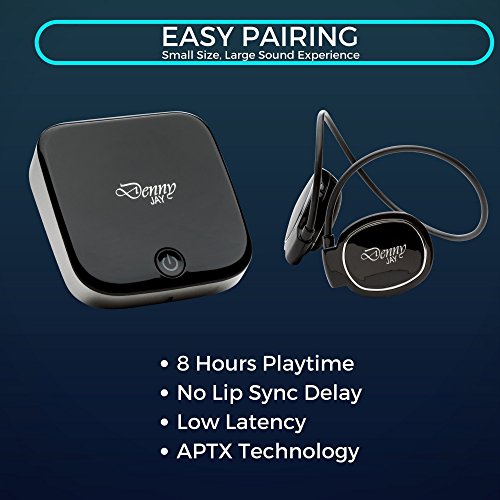 -. Feature : CONVENIENT FOR TRAVEL The complete, hands-free, portable kit includes 2 sets of headphones, a transmitter, and a sleek carrying case. Everything is compact enough to fit effortlessly in a backpack, briefcase, or purse. The transmitter itself is small enough to carry in your pocket. This makes the DJ Headset perfect for travel whether you are by yourself, with a partner, or with children. Your kids will love it for long road trips or flights if they want to watch a movie or play on their ipad. / SHARING IS CARING There are tons of wireless bluetooth headsets on the market, but most are designed for one person. The value in the Denny Jay Headset Duo is that you get one transmitter and two high quality, over-ear wireless headphones with bluetooth. Being able to share one transmitter for music that plays over two earphone sets is great for activities with a friend like watching movies, hiking, biking, running, or going to the gym. It's also great for commuting on the subway facebook etc / TOP NOTCH PRODUCTION Our product was derived from one of the leading mini bluetooth headset manufacturers in the world that utilizes the most up-to-date Bluetooth CSR technology. After many months of research and development, Denny Jay has created a product with the best available technology to deliver an entertainment package truly tailored for you and your friends. The UK CSR and bluetooth technology ensures the transmitter and headphones pair efficiently with low latency APTX technology.. / SUPERIOR SOUND QUALITY You will be blown away at the sound quality of this bluetooth headphones and transmitter for home and travel. We've transformed the act of merely listening to music to being an unbeatable sound experience. Don't be fooled by the pint-size of the headphones as they;pack an unbelievable punch with their seamless and clean sound quality, accented by a perfect balance of bass and treble.Answer incoming calls.Music will come alive in a way you've never enjoyed it before. / INCREDIBLY VERSATILE While these bluetooth headphones on ear are great for rocking out to beats, they can be used to connect to your television, Ipod, or Ipad or mobile phone. Have trouble hearing your TV? Pop these comfortable earpieces on for an enjoyable, unstrained, audible movie experience. Want to watch something on in public? You don't even need a plug-in to listen to it without bothering others. Our universal headset and transmitter link to almost all electronics and brands.