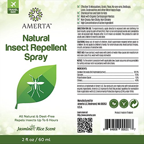 -. Feature : REPELS INSECTS & BUGS - Effective to Mosquitoes, Gnats, Fleas, No-seeums, Bedbugs, Lices, Cockroaches and other Bites-happy bugs. High concentration of active ingredients (>92%). Protection for up to 6 hours. / ALL NATURAL & DEET FREE - Made with organic cymbopogon nardus and other natural ingredients. Deet-Free and Zero Synthetic Toxins. Safe for Adults, Children (older than 6 months), Pregnant Women and Pets. / USER FRIENDLY RECIPE - Non-greasy, Non-sticky, Non-streaky. 100% Biodegradable, Non-GMO, Vegan, Cruelty Free. With pleasant jasmine rice scent. / MONEY BACK GUARANTEE - Amerta promise is a 100% Money Back Guarantee. If you're not satisfied with our product, we'll refund your purchase. / ALUMINUM BOTTLED - Packaged in Anti-crush, Anti-puncture, Non-aerosols, Non-flammable aluminum pump spray bottle. Portable for outdoor activities and travel.