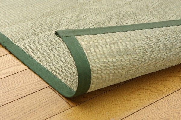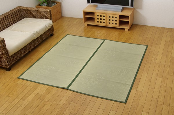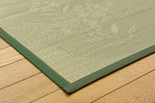 織りで花柄の凹凸を出したイ草カーペットです。い草には空気の自然浄化作用、湿度の調節作用などがあります。また汚れにくく、使用するうちに黄金色に変化し、味が出ます。い草に青森ヒバ加工を施しています。(抗菌・防臭効果)