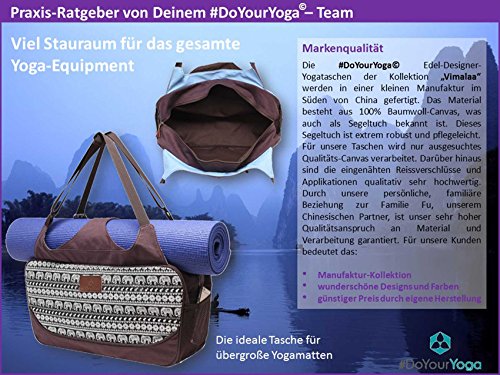 MarkenqualitätMit der Yogatasche »Vimalaa« von #DoYourYoga© erwirbst Du eine wunderschöne, hochwertige und vielseitige Yoga-Sporttasche für mehr Spaß bei Deinem Yogasport. Neben der erstklassigen Verarbeitung besticht die »Vimalaa« Yoga-Tasche durch ansprechende Farben und einzigartige Designs. Besonders praktisch ist der über die Tasche laufende Gurt mit Klettverschluss zum Transport Deiner Yogamatte. Die Matte wird einfach auf die Tasche gelegt und mittels Gurt befestigt. Somit bleibt im Innernen der Tasche genügend Platz für Deine Yoga-Accessoires wie Kleidung, Yoga-Blöcke, Kissen, Gurte uvm. Außderdem verfügt die Yoga-Tasche »Vimalaa« über eine Außentasche mit Reißverschluss und zwei Fächer z.B. für den Transport von Trinkflaschen. Weiterhin sind an unserer Yogamatten-Tasche praktische, verstellbare Tragehenkel angebracht. Hiermit hast Du die Möglichkeit, den Yogabag auch als Schultertasche zu tragen. Eine ideale Sport-, Yoga- und Freitzeittasche mit vielseitigen Einsatzmöglichkeiten.