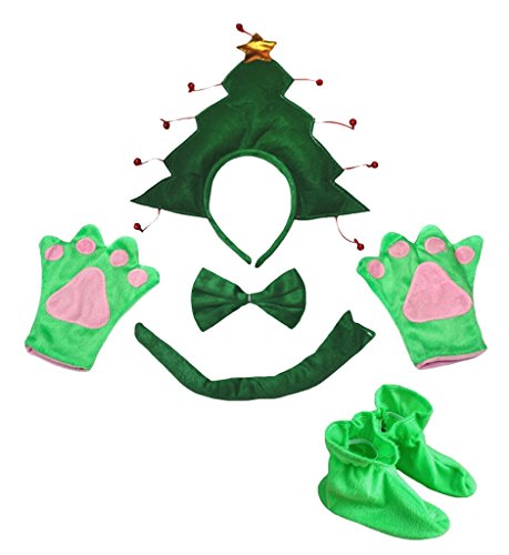 -. Feature : Product includes: a headband, a bow tie, a tail, pair of paws, pair of shoes. / Lightweight material. / By polyester and cotton. / Fixed size for unisex children. / Xmas tree costume for children.
