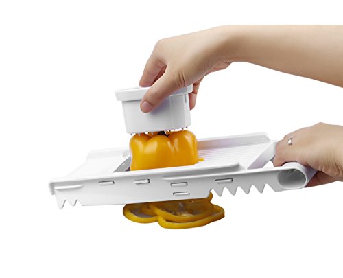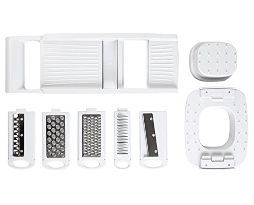 - Components: 1 main unit, 5 blades (flat, julienne, shredder, grater, wavy), 1 food holder, 1 food guide. Covers all the ground of cooking prep.