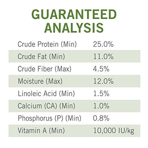 Crude Protein (Min)...25.0%, Crude Fat (Min)...11.0%, Crude Fiber (Max)...4.5%, Moisture (Max)...12.0%, Linoleic Acid (Min)...1.5%, Calcium (Ca)(Min)...1.0%, Phosphorus (P)(Min)...0.8%, Vitamin A (Min)...10,000 IU/kg.