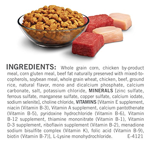 Whole Grain Corn, Chicken By-Product Meal, Corn Gluten Meal, Beef Fat Naturally Preserved with Mixed-Tocopherols, Soybean Meal, Whole Grain Wheat, Chicken, Beef, Ground Rice, Natural Flavor, Mono and Dicalcium Phosphate, Calcium Carbonate, Salt, Potassium Chloride, Minerals [Zinc Sulfate, Ferrous Sulfate, Manganese Sulfate, Copper Sulfate, Calcium Iodate, Sodium Selenite], Choline Chloride, Vitamins [Vitamin E Supplement, Niacin (Vitamin B-3), Vitamin A Supplement, Calcium Pantothenate (Vitamin B-5), Pyridoxine Hydrochloride (Vitamin B-6), Vitamin B-12 Supplement, Thiamine Mononitrate (Vitamin B-1), Vitamin D-3 Supplement, Riboflavin Supplement (Vitamin B-2), Menadione Sodium Bisulfate Complex (Vitamin K), Folic Acid (Vitamin B-9), Biotin (Vitamin B-7)], L-Lysine Monohydrochloride. E-4121.