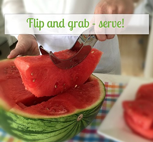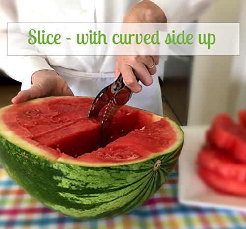 PERFECT SLICES The wire blade easily cuts the melon into straight, even slices. Flip the tool over and use the curved side like a pair of watermelon tongs to lift and serve.