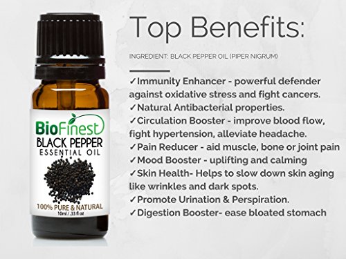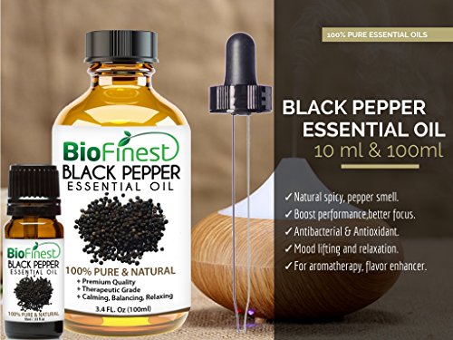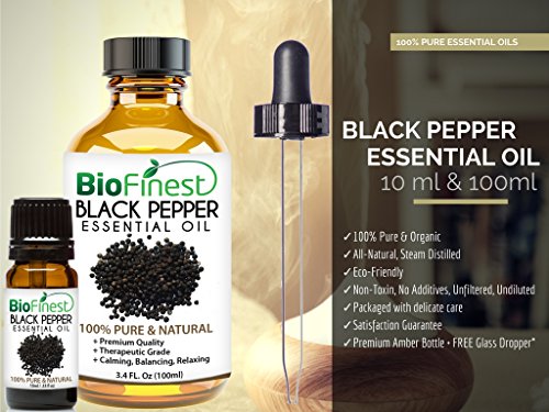 -. Feature : PREMIUM QUALITY BLACK PEPPER OIL: 100% Pure - Non-Toxic - No Additives - Unfiltered and Undiluted with No Fillers. Vegan certified, paraben free and cruelty free. / FREE E-BOOK GUIDE (worth $37): Exclusive access to Biofinest comprehensive essential oil guide "100 Ways To Use Essential Oil". Printable and beginner friendly! / PACKAGED IN USA, ELEGANT AMBER BOTTLE: Comes with premium euro dropper cap for easy dispensing. No Leakage or Dripping. Best value for your money! / 100% SATISFIED OF MONEY BACK: We are eco-friendly USA company who stand behind our brand. Try our products risk-free with 100% money back guarantee. / 50+ BESTSELLERS: Basil, Bergamot, Cinnamon, Citronella, Clary Sage, Clove Leaf, Coriander, Cypress, Eucalyptus, Frankincense, Geranium, Ginger, Green Tea, Jasmine, Juniper Berry, Lavender, Lemon, Lemongrass, Lily Flower, Mandarin, Marjoram, Myrrh, Neroli, Orange, Oregano, Patchouli, Peppermint, Pine, Roman Chamomile, Rosemary, Sandalwood, Spearmint, Tea Tree, Thyme, Vetiver, Wintergreen, Ylang Ylang, Aloe Vera, Argan, Coconut, Evening Primrose, Flaxseed, Grapeseed, Jojoba, Pomegranate seed.