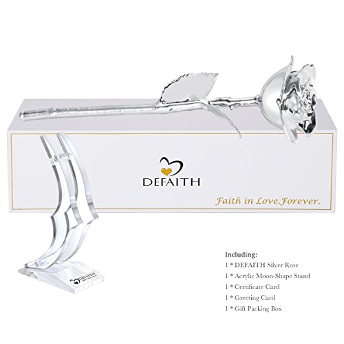 Classic Gift Box - Provide 100% protection for the precious gift. Including DEFAITH Silver Rose, Acrylic Moon Shaped Stand, Gift Card and Certificate Card.