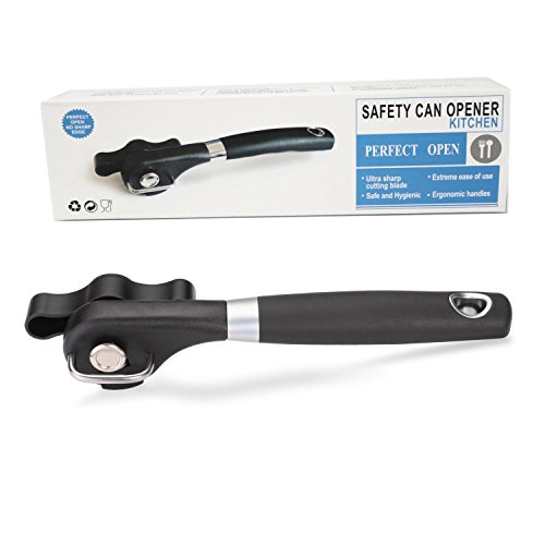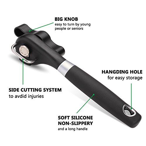 - PERFECT GIFT - This side cutting safety can opener is quite simple to operate. The combination of the big knob, long ergonomic silicon handle, and sharp cutting wheel makes opening cans an effortless task, even for senior citizen with weak hands from arthritis and wrist problems. The opener comes with an amazing FREE BONUS, a bottle opener. Easy to clean, this can opener makes a fantastic present for any occasion Such as Weddings, Christmas gifts,Black Friday,and Housewarming Parties