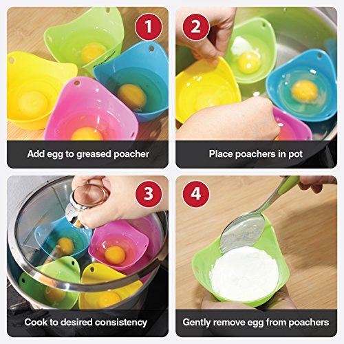 EASY TO USE AND CLEAN - The non-stick silicone lets your cooked eggs slide out easier and without a mess. Poach your eggs on a stovetop or microwave. Dishwasher safe too! For easier clean-up you can use a cooking spray.