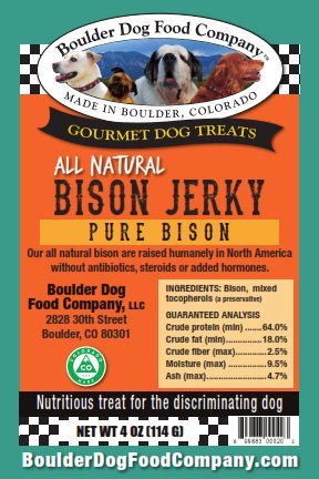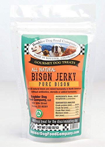 -. Binding : Misc. -. Brand : Boulder Dog Food Company LLC -. Feature : Single Ingredient - 100% Bison Meat / No Added Hormones, Antibiotics or Steroids / Nutritious & All Natural / Shipped Fresh from our Bakery / Made in the U.S.A -. Label : Boulder Dog Food Company LLC -. Manufacturer : Boulder Dog Food Company LLC -. PackageQuantity : 1 -. ProductGroup : Pet Products -. ProductTypeName : PET_SUPPLIES -. Publisher : Boulder Dog Food Company LLC -. Studio : Boulder Dog Food Company LLC -. Title : Boulder Dog Food Company Bison Jerky