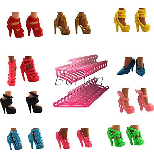 -. Feature : Perfect fit for Barbie & other 30cm/11.5" dolls / Package includes:10 Shoes & 10 Hangers for Barbie Doll( RANDOM STLYES) / Doll not included / All clothes are handmade and good quality,100% Brand new material / Made by Barwa, Leading Doll Clothes Manufacturer, Not affiliated with Mattel.