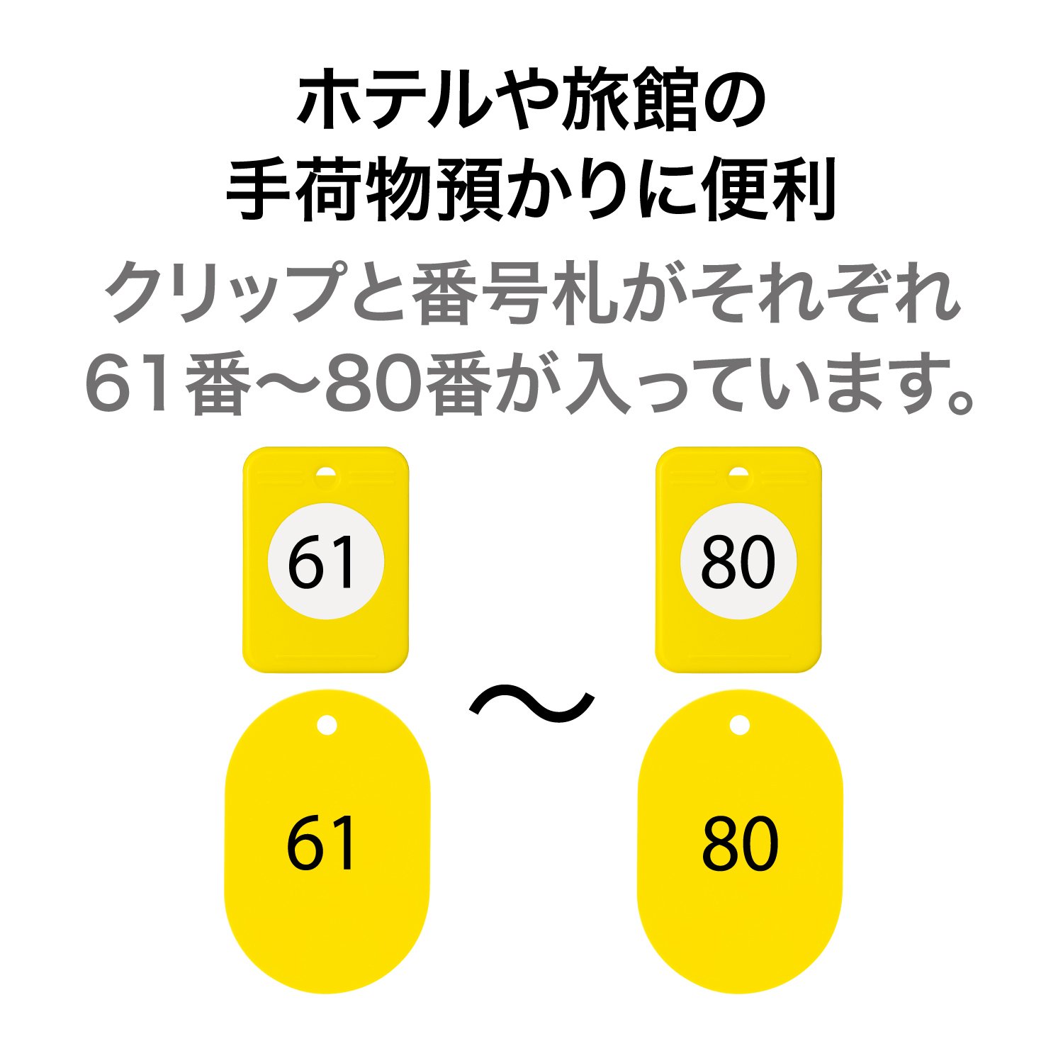 【本体サイズ】W33×D46×H27mm(クリップ) W40×D60×H2.7mm(番号札) 【材質】ABS(クリップ) 再生PS(番号札) 【内容】20組セット 61~80番 【生産国】日本