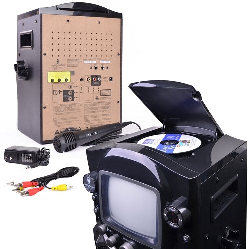 Delight your friends and family with the Singing Machine STVG569 Karaoke System with 5.5″ B&W monitor and microphone. Providing rich audio via the powerful built-in speaker system, this top loading CD+G karaoke system will give you and your audience the ultimate karaoke experience. The STVG569 karaoke system plays CD + Graphics discs and music CDs. It displays scrolling lyrics on its front panel 5.5″ monitor, so you won't miss a beat while singing. This karaoke system has two mic jacks with separate volume controls so you can sing a duet without competing for the microphone. Balance and echo controls will have you sounding your best!Feature