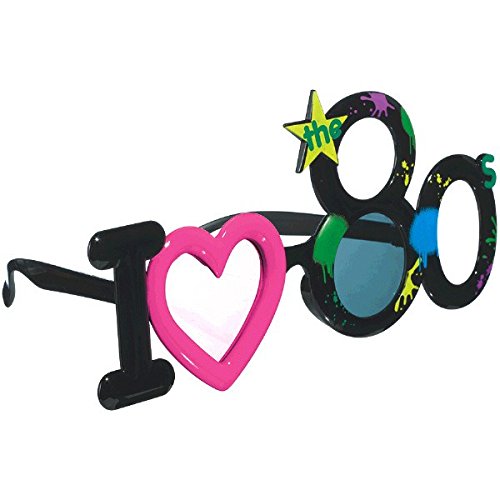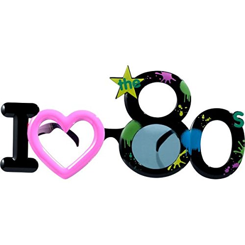 These novelty sunglasses feature a frame that spells out "I ♥ the 80s" as well as neon paint splatter detail and a bright pink heart.