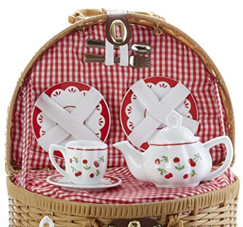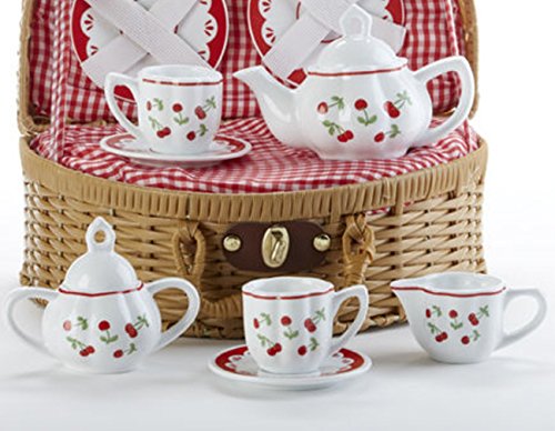 Cherries! This irresistible child-sized wicker picnic basket is all ready to grab and go for a doll-sized tea party! A real pouring porcelain tea pot, 2 dainty little teacups, 2 little plates just right for serving yummies, tiny spoons and forks, and a cream and sugar set are tucked neatly inside. Dishwasher safe for ages 5 and up. Very charming!Feature