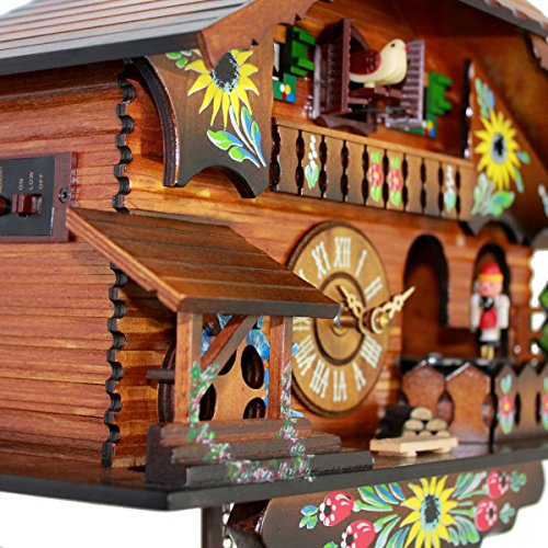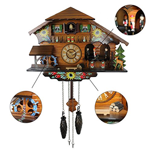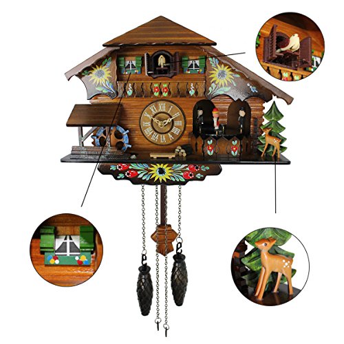 -. Feature : REAL FUNCTIONAL CUCKOO CLOCK PENDULUM with gorgeous precise craftsmanship when time's up: cuckoo calls, music rings, and physical objects moving - bird pops out, dancers dance, watermill rotates / GREAT CUCKOO CLOCK COMPONENTS COMBINING: quartz movement makes time more accurate, automatic shut off in the darkness by light sensor, easy setup with 1 button and 1 switch / 1 SWITCH AND 1 BUTTON easy to setup and operating / Approximate Dimension: 14.7 x 6.1 x 9.2 inches (without pendulum) / This cuckoo clock powered by 3 Type C batteries(not included). We recommend that change batteries twice a year for optimum performance and enjoyment. Batteries are not require to take off if you go out for a short vocation