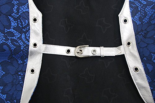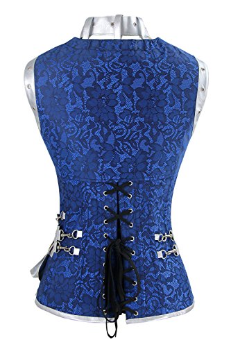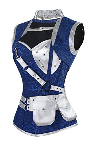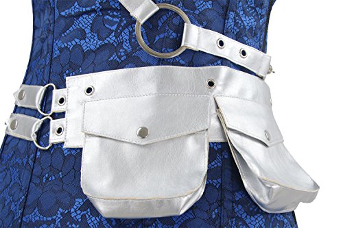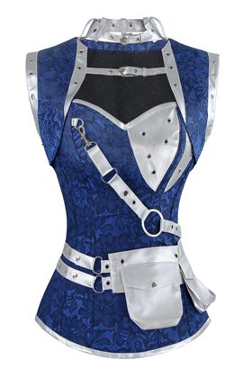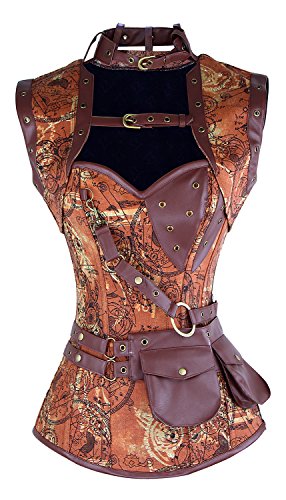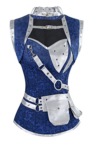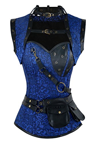 Steampunk Gothic Sexy Overbust Corset, Attached 13 Spiral Steel Boning, with Removable and Adjustable High Neck Shrug and Two Pouches, Faux Leather and Brocade Material, Zipper Closure at Side, Lace-up in Back for Cinching, Matching G-string.