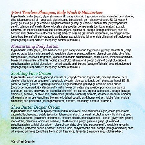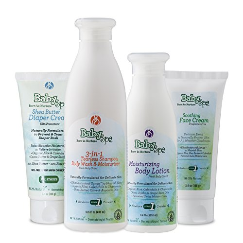 This complete pack will nourish and pamper your baby's delicate skin providing a sense of Zen. Patented Swiss Moisturizers will soothe, hydrate and protect delicate skin, while SongaTM, our exclusive organic ethnobotanical, will provide skin nourishment. Organic Chamomile, Calendula and Rosemary will calm the senses, while our nourishing emollients such as Organic Aloe, Shea Butter, Olive and Avocado oils deeply hydrate your baby's skin from head to toe. Our Diaper cream contains 32% Shea Butter and 10% Cocoa Butter to nourish and hydrate skin, 12% Zinc Oxide to create a natural barrier against wetness. Safe and gentle for everyday use on delicate newborn skin, all products are 100% Free of Parabens, PEG, Phthalates, Sulfates (SLS/SLES), Petrolatum, Mineral Oil; Hypoallergenic , Dermatologist tested and with No animal testing. Stage One Nourishing Essentials bundle includes: Stage one 3 in1 Tearless Shampoo/Body Wash/ Moisturizer (13.5oz) and our Moisturizing Body Lotion (8.4oz) with our Signature fresh Baby Scent, and Our Fragrance-Free Soothing face Cream (3.4oz) , and Shea Butten Diaper Cream (3.4oz)Feature