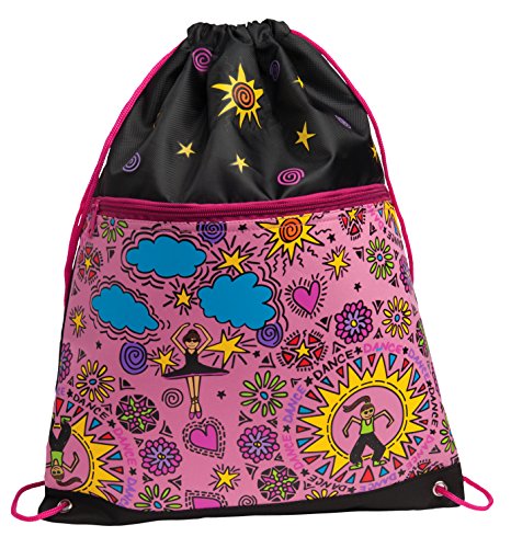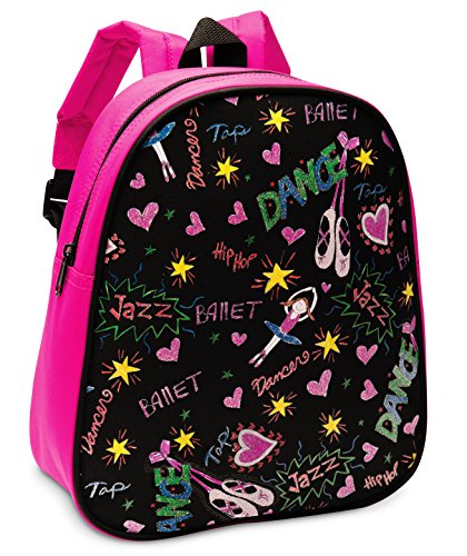 -. Feature : Girl's dance backpack with colorful screenprint. / Microfiber material with glitter highlights. / Interior mesh pocket. / Fully lined. / Measures 10.25" x 12" x 3.75"