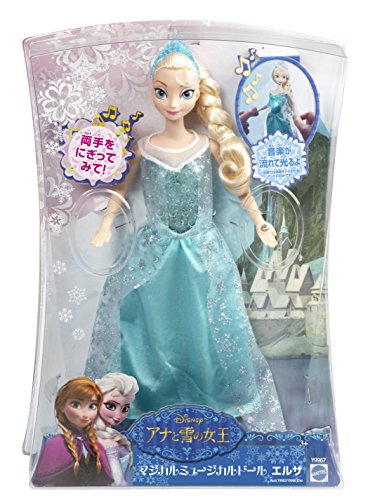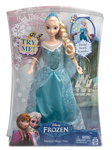 -. Binding : Toy -. Brand : Mattel -. Department : Elsa ~11.5" Disney Frozen Musical Magic Fashion Doll -. EAN : 0746775264079 -. Feature : Inspired by the hit new Disney animated film, Frozen / Girls will love reenacting their favorite scenes from the movie / Elsa is featured in a glittery, glamorous fashion iconic to the film / Hold her hand and Elsa will magically light up and play enchanting music / Includes 1 Musical Magic Elsa Doll -. IsAdultProduct : 0 -. Label : Mattel -. LegalDisclaimer : Returns subject to restocking fees OF 20%Returns on unopened boxes only, Returns subject to 20% restocking fees -. Manufacturer : Mattel -. Model : Y9967 -. MPN : Y9967 -. PackageQuantity : 1 -. PartNumber : Y9967 -. ProductGroup : Toy -. ProductTypeName : TOYS_AND_GAMES -. Publisher : Mattel -. ReleaseDate : 2013-10-01 -. Studio : Mattel -. Title : Disney Frozen Musical Magic Elsa Doll -. UPC : 400069397699 -. Warranty : 1 year warranty against manufacturer defects