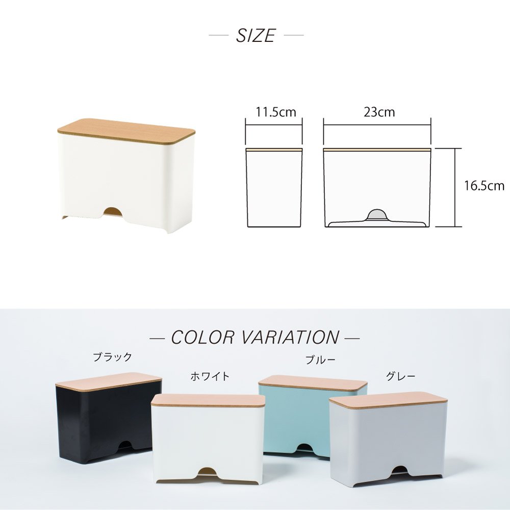 サイズ:W23×D11.5×H16.5cm 素材・材質:ABS樹脂(本体)、ブナ突板MDF(蓋)、シリコン(滑り止め)