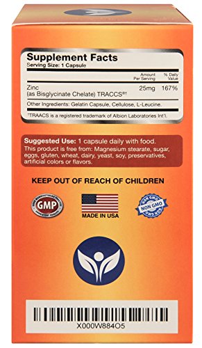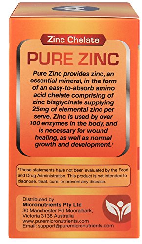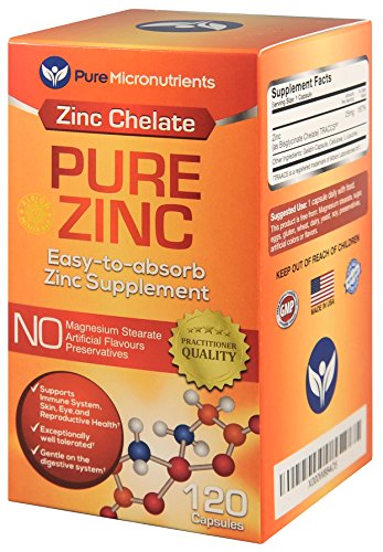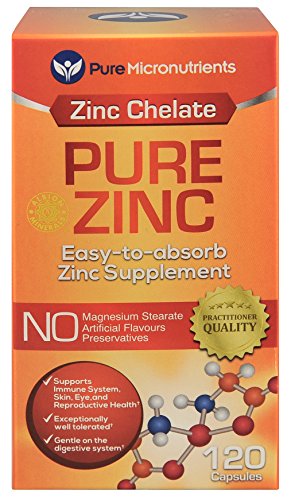 -. Binding : Health and Beauty -. Brand : Pure -. Color : Orange -. EAN : 0784672302166 -. Feature : USA Made. Practitioner Quality, Premium Chelated Zinc supplement, in an easy to swallow capsule that is gentle on the stomach. / Zinc chelate (Bisglycinate TRACCS) is clinically proven to be a highly absorbable and tolerable form of Zinc. † / Non-GMO and Free from Magnesium Stearate, Sugar, Salt, Gluten, Eggs, Soy, Dairy, Yeast, Preservatives, Artificial Colors or Flavors. / Perfect zinc vitamin supplement for men, women, elderly, pregnant women, & teenagers. / Zinc is the principal regulator of cell function and growth within the body. It is an essential mineral for DNA synthesis and cell division within the body, promoting reproductive, skin, hair and eye health. Zinc also boosts the immune system, promotes healthy cell replication, supporting optimal cardiovascular function and helps regulate moods. † Customer Promise - 60 day MONEY BACK GUARANTEE! -. Label : Pure Micronutrients -. LegalDisclaimer : We recommend that you do not solely rely on the information presented and that you always read labels, warnings, and directions before using or consuming a product. For additional information about a product, please contact the manufacturer. Content on this site is for reference purposes and is not intended to substitute for advice given by a physician, pharmacist, or other licensed health-care professional. You should not use this information as self-diagnosis or for treating a health problem or disease. Contact your health-care provider immediately if you suspect that you have a medical problem. †Information and statements regarding dietary supplements have not been evaluated by the Food and Drug Administration and are not intended to diagnose, treat, cure, or prevent any disease or health condition. -. Manufacturer : Pure Micronutrients -. ProductGroup : Health and Beauty -. ProductTypeName : HEALTH_PERSONAL_CARE -. Publisher : Pure Micronutrients -. Studio : Pure Micronutrients -. Title : Pure Zinc - Best Zinc Supplement, 25mg, 120 Count, Natural Bisglycinate TRACCS (Albion Labs Chelated Zinc) -. UPC : 784672302166