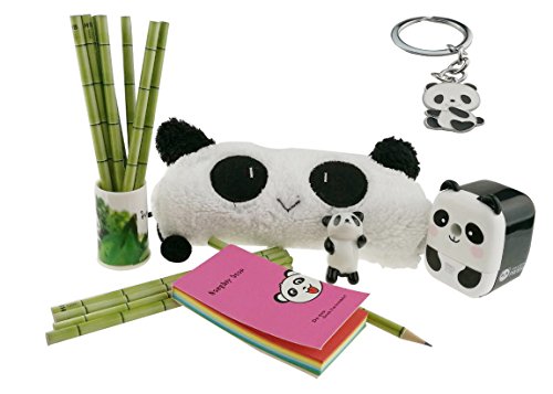 Not just adorable,but also useful.It includes 1 mini pencil holder with 12 pencil,1 key chain,1 pen case,1 sharpener,1 notepaper and 1 ceramic panda toy
