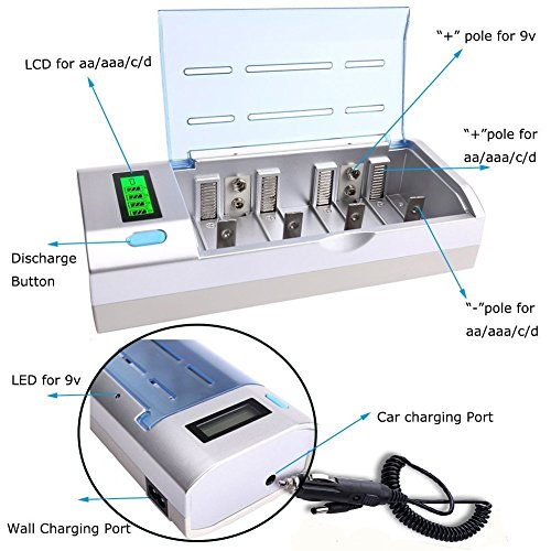 SMART COMPATIBILITY: Can charge 1-4 pcs AA/AAA/SC/C/D and 1-2 pcs 9V Ni-MH/Ni-Cd rechargeable batteries,of different sizes and brands, simultaneously