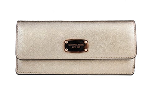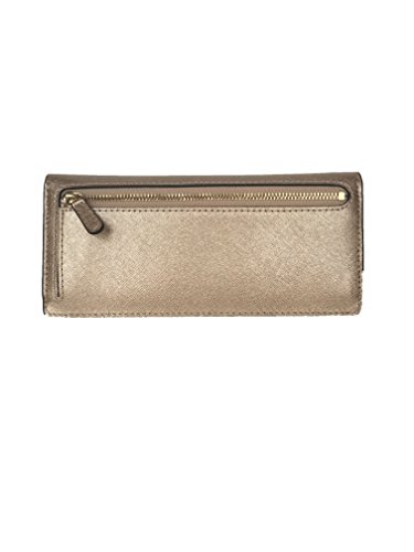 -. Feature : Pale gold saffiano finished leather with polished pale gold tone hardware / Flap style snap closure on the front and accordion zippered pocket on the back / Features 8 card slots and 2 full length bill compartments / Front is accented with logo nameplate which has been updated for 2015 with rounded corners / Measures approximately 7.75" (L) x 3.75" (H) x 1" (W)