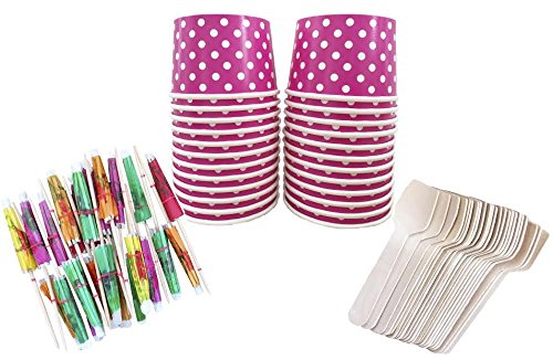Outside the Box Papers Hot Pink and White Polka Dot Mini Ice Cream Kit with Paper Umbrellas and Mini Wooden Spoons 24 Pack Hot Pink, White