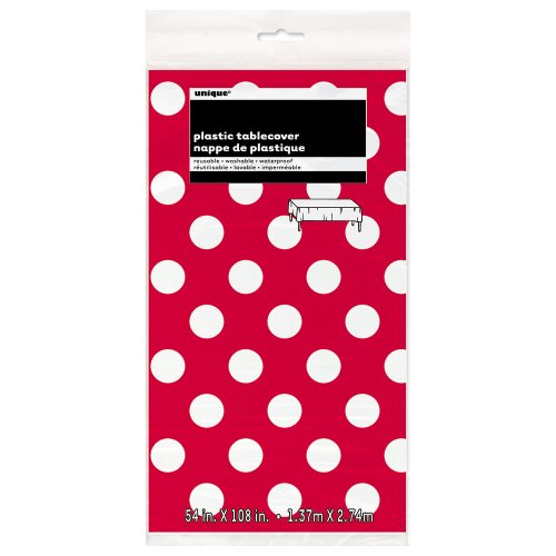 - Feature : 1 Red Polka Dot Plastic Table Cover / Red Polka Dot Plastic Table Cover measures 54" x 108" / Red Polka Dot Plastic Table Cover features a solid red background with white polka dots / Perfect for protecting your table against unexpected spills and stains / Search for other Red Polka Dot party supplies and solid color party decorations from Unique