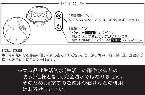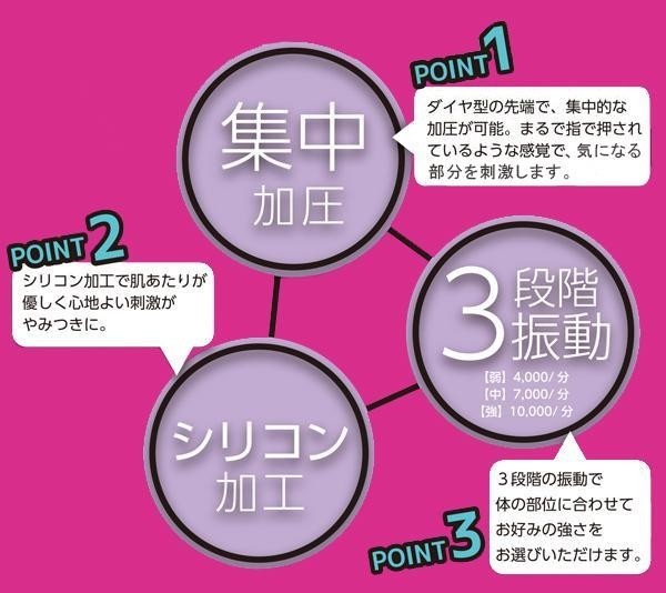 ダイヤ型形状で、集中的な加圧が可能。さらに、3段階の振動機能で全身を心地よくほぐします!!首・肩・背中・腕・腰・足・足裏などの部位を選ばない、オールマイティーなリラックスグッズです♪また、シリコン加工なので肌あたりが優しく心地よい刺激がやみつきに☆ |