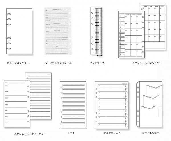 | セット内容 | 本体、リフィル(ガイドプロテクター×2枚、パーソナルプロフィール×1枚、ブックマーク×1枚、スケジュール/マンスリー×20枚、スケジュール/ウィークリー×20枚、ノート×20枚、チェックリスト×10枚、カードホルダー×1枚) |