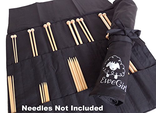 - A needle roll that includes two rows of 12 pockets of various widths for straight and double point needles up to 15” in length completed with a tie-closure; EweGirl logo on front and reverse logo on back