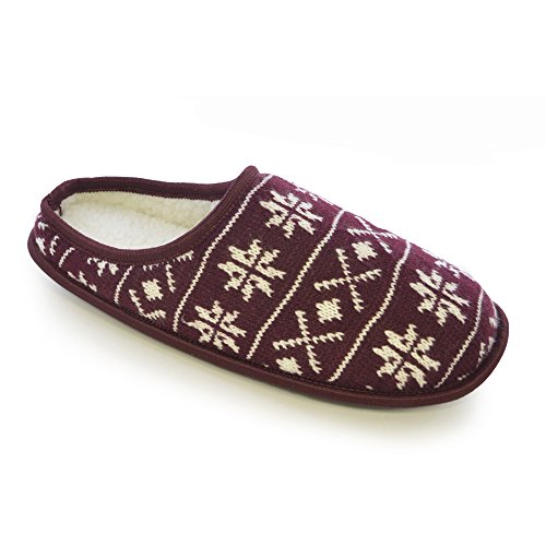 -. Feature : Mens knitted mule slippers with Fairisle snowflake design. / Soft Sherpa fleece lined inner. / Patterned sole for added floor traction. / Choice of 2 colors. / Choice of 3 sizes.