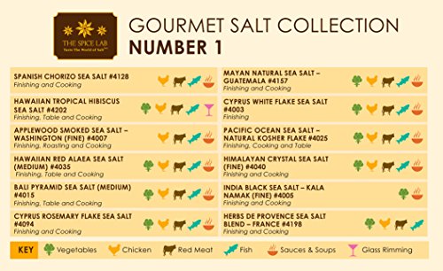 - FLAVORS: No. 3 - Cyprus White Salt, No. 5 - India Kala Namak Black Salt, No. 7 - Applewood Smoked Salt, No. 15 - Bali Pyramid Salt, No. 35 - Hawaiian Red Alaea Salt, No. 40 - Himalayan Pink Salt (Fine), No. 94 - Cyprus Rosemary Salt, No. 128 - Spanish Chorizo Salt, No. 157 - Guatemalan Fleur de Sel Salt, No. 198 - Herbes de Provence & Fleur de Sel Blend & No. 202 - Tropical Hibiscus Salt